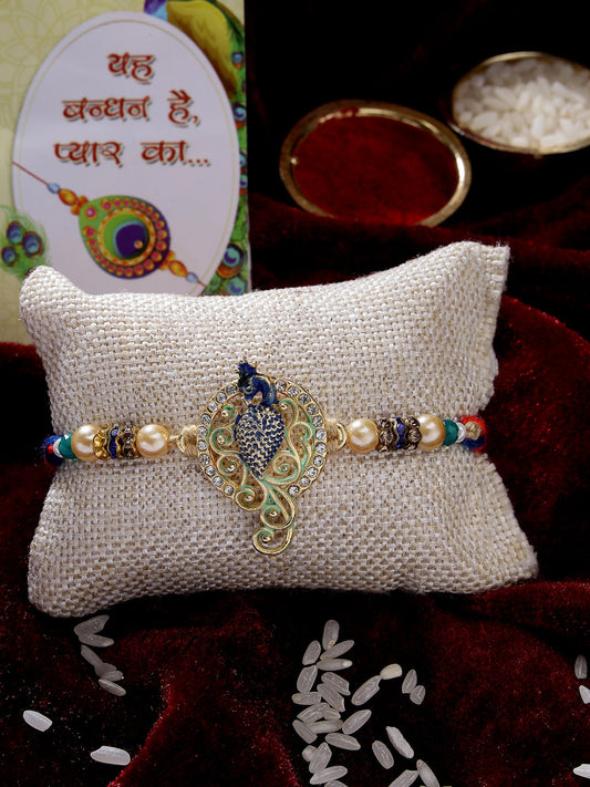 Men Gold-Toned Peacock Design Stone-Studdded Rakhi With Roli Chawal & Chocolate Style Note: Celebrate Raksha...