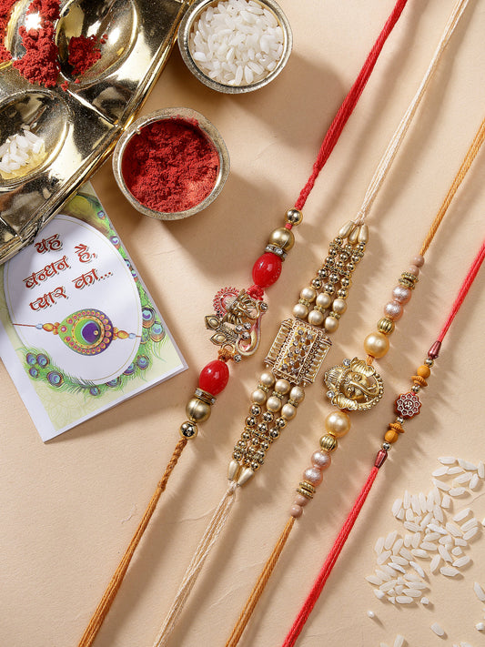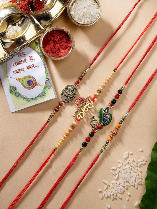 Men Set of 4 Multicolor Stone-Studded Ganesh Rakhi With Roli Chawal Style Note: Celebrate Raksha...
