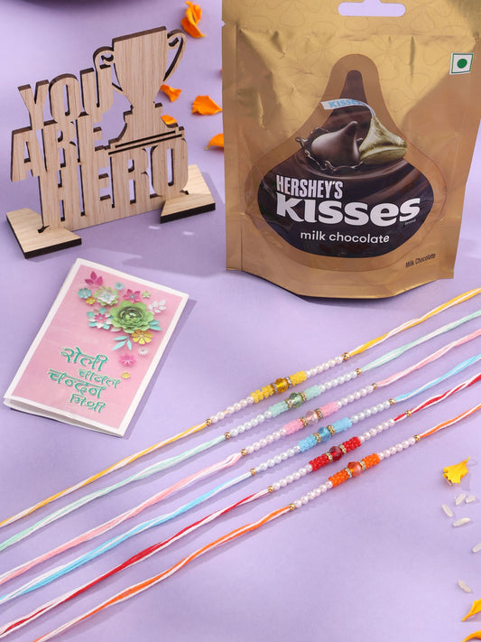 Men Set of 4 Multicolor Stone-Studded Rakhi With Roli Chawal & Chocolate Style Note: Celebrate...