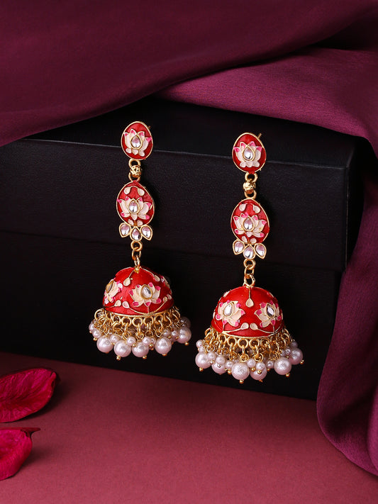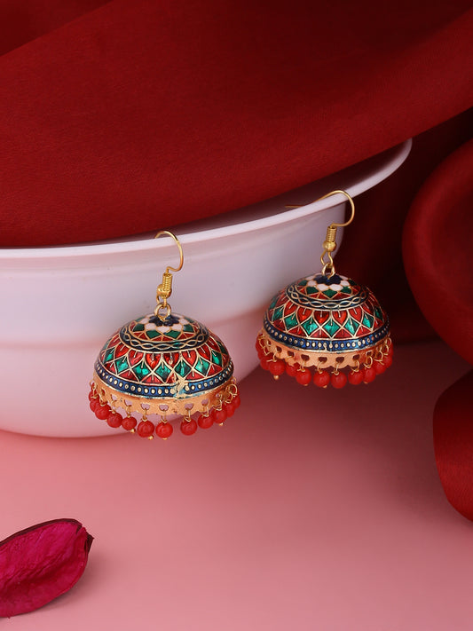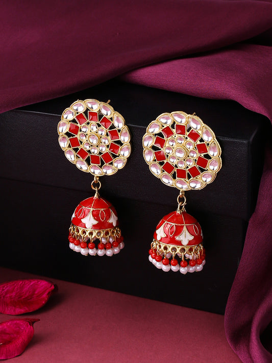 Red Dome shared Jhumkas, gold plated has artifical stones and kundanm secured with a post...