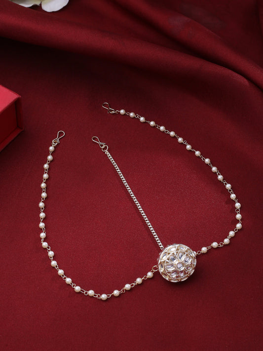 Gold Plated White Kundan Studded and beaded Matha Patti, secured by hook closure. Style Note: Head...