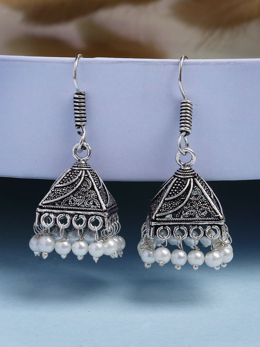 Style Note: NVR Women Oxidized Silver Plated White Artificial Beads Jhumka Earrings offer a stunning...