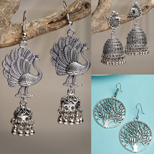 Set of 3 Silver-Toned German Silver Oxidised Dome Shaped Jhumka Earrings Style Note: Elevate your...