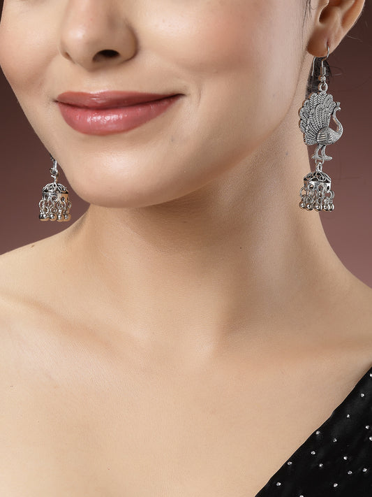 Silver-Toned Peacock Design German Silver Oxidised Dome Shaped Jhumka Earrings Style Note: Adorn yourself with...