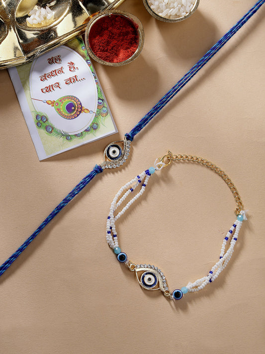 Unisex Set of 2 Blue Evil Eye Bhaiya Bhabhi Rakhi Set With Roli Chawal Style...