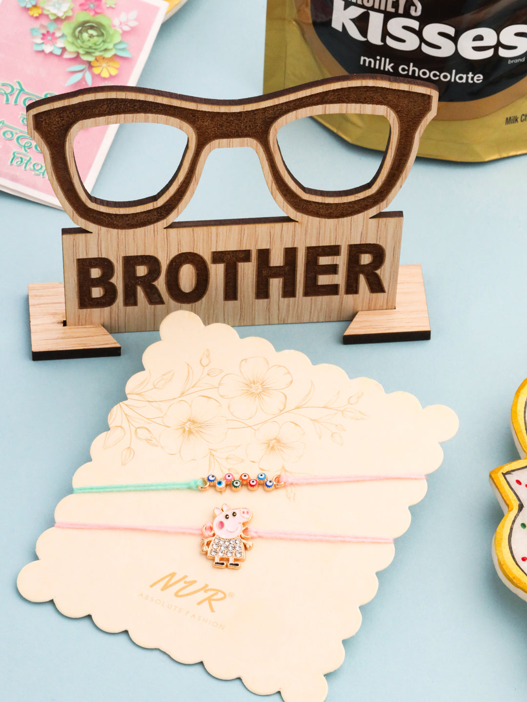 Style Note: Make this Raksha Bandhan extra special for your little ones with the NVR Kids Set of 2 Cartoon Artificial Stones Thread Rakhis. Featuring bright, vibrant threads and cute cartoon designs, these rakhis are adorned with sparkling artificial stones, adding a playful and festive charm to the occasion. Comfortable, fun, and easy to wear, they’re perfect for young siblings who want to celebrate in style. Complete with Roli, Chawal, Chandan, Mishri with Assorted MDF wooden stand & 33.6 gm Hershey's Kisses Chocolate, this set combines tradition with a playful twist, making it the ideal gift to celebrate sibling love and joy.