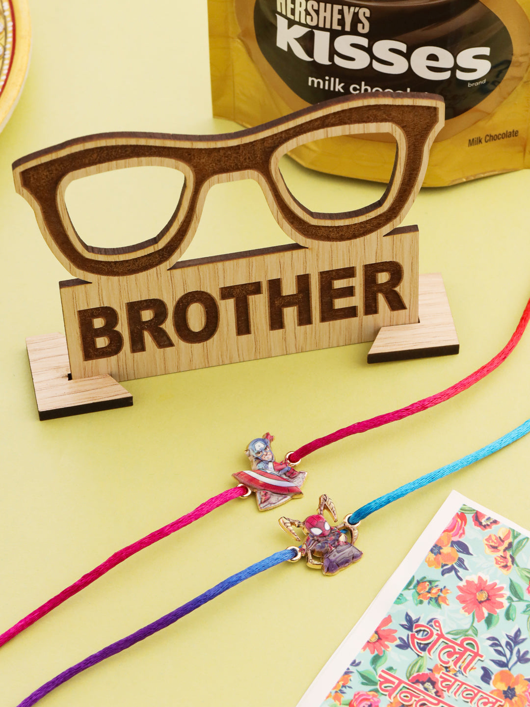 Style Note: Make Raksha Bandhan even more special for your little ones with this delightful set of 2 cartoon character rakhis from NVR Kids. Featuring a playful mix of purple and red threads, each rakhi is adorned with beloved cartoon characters that kids will love to wear. Soft, colorful, and easy to tie, these rakhis add a cheerful touch to the celebration while keeping the traditional spirit intact. Complete with Roli, Chawal, Chandan, Mishri with Assorted MDF wooden stand & 33.6 gm Hershey's Kisses Chocolate, this set is the perfect way to celebrate the sibling bond in a fun and festive way. A sweet and meaningful gift for your young siblings on this joyous occasion.
