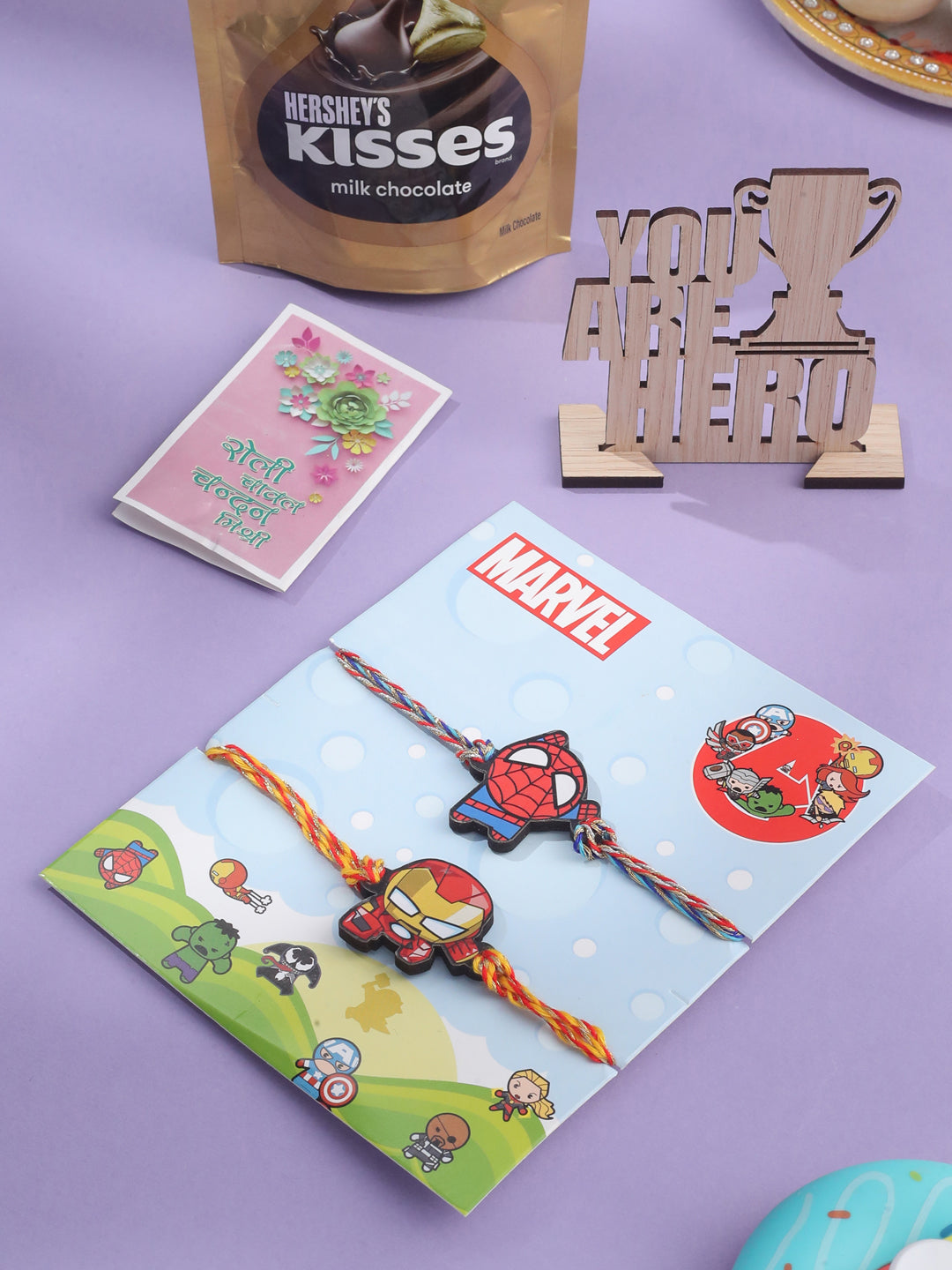 Style Note: Celebrate Raksha Bandhan with the NVR Kids Set of 2 Cute Cartoon Superhero Thread Rakhis. Featuring vibrant cartoon superhero characters, these Rakhis are perfect for your little Bhaiya. The fun and playful designs will bring excitement and joy to their celebration. The adjustable thread ensures a comfortable fit for all wrist sizes. Complete with Roli, Chawal, Chandan, Mishri with Assorted MDF wooden stand & 33.6 gm Hershey's Kisses Chocolate, this set allows for traditional Raksha Bandhan rituals. A cheerful and meaningful gift to express love, protection, and happiness on this special day.
