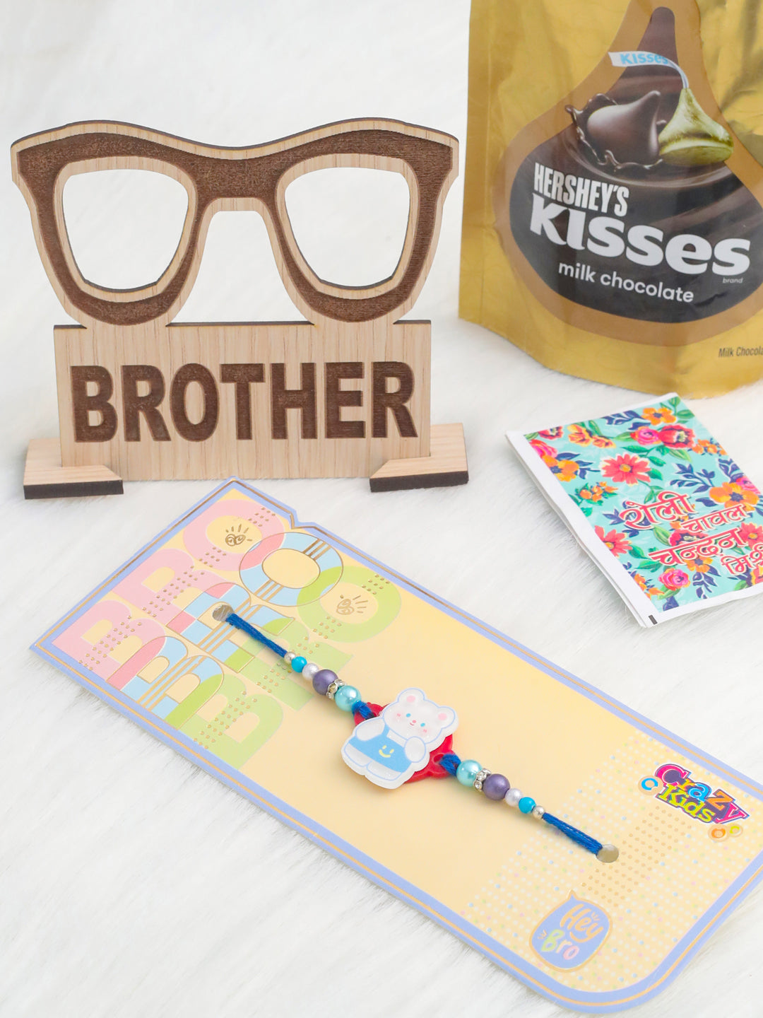 Style Note: Celebrate Raksha Bandhan with the adorable NVR Kids Teddy Blue Artificial Beads Thread Rakhi. Featuring a cute teddy bear design with artificial beads, this Rakhi is perfect for your little Bhaiya. The fun and charming design adds a sweet touch to the celebration. The adjustable thread ensures a comfortable fit for all wrist sizes. Complete with Roli, Chawal, Chandan, Mishri with Assorted MDF wooden stand & 33.6 gm Hershey's Kisses Chocolate, it’s ideal for performing the traditional Raksha Bandhan rituals. A joyful and meaningful gift to express love, care, and happiness for your little one.