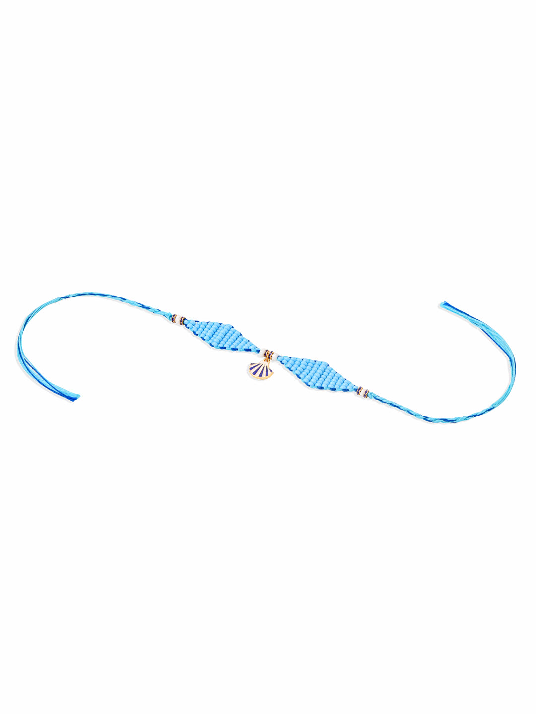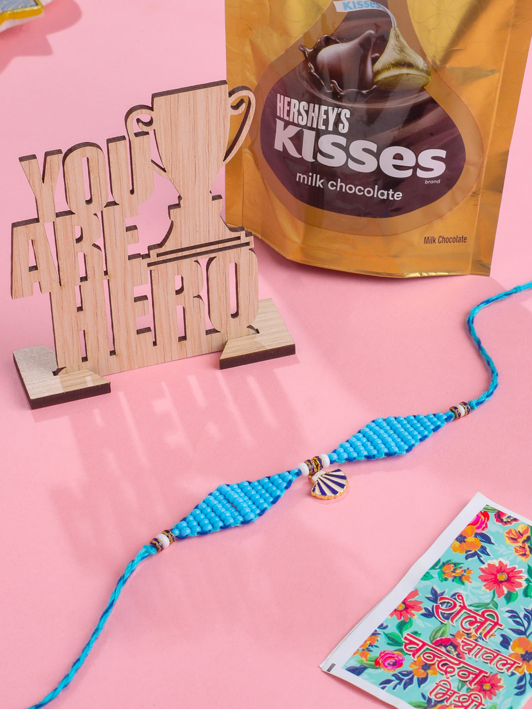 Style Note: Celebrate the special bond of Raksha Bandhan with the NVR Men Blue Pearls Unique Design Thread Rakhi. Featuring elegant blue pearls in a unique design, this Rakhi adds a touch of sophistication and charm to your celebration. Perfect for your Bhaiya, it symbolizes love, care, and protection. The adjustable thread ensures a comfortable fit for all wrist sizes. The set comes complete with Roli, Chawal, Chandan, Mishri with Assorted MDF wooden stand & 33.6 gm Hershey's Kisses Chocolate for the traditional Raksha Bandhan rituals. A beautiful and meaningful gift to convey your affection and blessings this Raksha Bandhan.