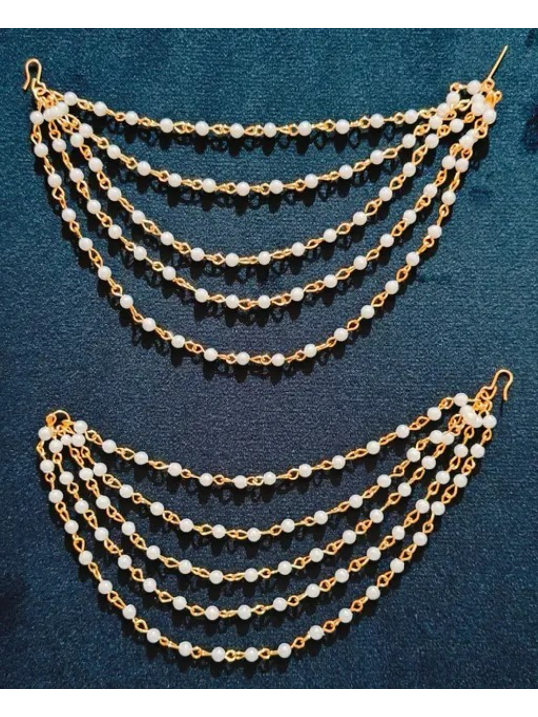 The Gold-Plated Pearls Studded Classic 5 Layered Ear Chain Ear Cuff is a chic and elegant accessory that adds a touch of sophistication to any outfit. Featuring a luxurious gold-plated finish, this ear cuff combines classic style with a contemporary design. Its layered structure creates a visually striking effect, while the lustrous pearls studded along the layers provide an added sense of refinement. The ear chain, connecting the cuff to your ear, adds a delicate yet bold finishing touch, allowing the piece to flow gracefully with your movements. Perfect for both everyday wear and special occasions, this ear cuff is a timeless and versatile addition to any jewelry collection.
