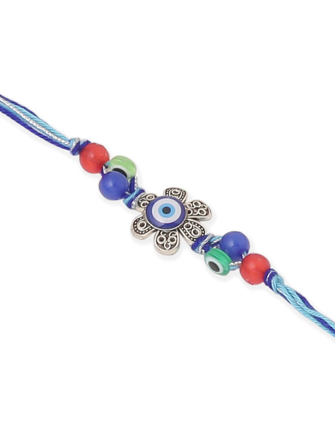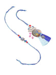 Style Note: Celebrate Raksha Bandhan with the stunning NVR Set of 2 Blue Evil Eye & Peacock Design Artificial Beads Bhaiya Bhabhi Rakhi. Featuring the protective blue evil eye and elegant peacock design, these Rakhis symbolize safety, love, and prosperity. Crafted with artificial beads, they add a touch of traditional charm and modern flair. The adjustable thread ensures a comfortable fit for all wrist sizes. Complete with Roli, Chawal, Chandan & Mishri, perfect for performing traditional Raksha Bandhan rituals. A meaningful and beautiful gift to express your affection and blessings this Raksha Bandhan.