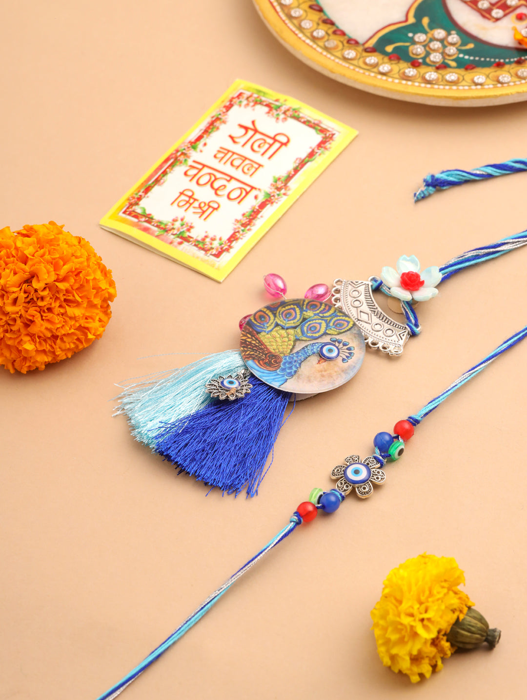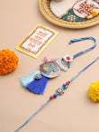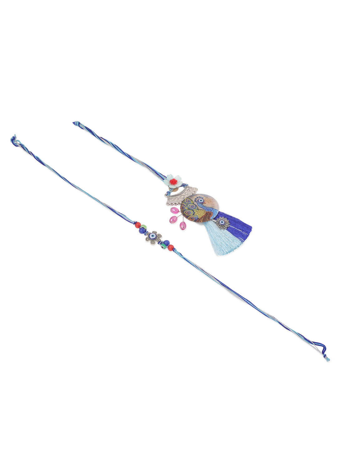 NVR Set of 2 Blue Evil Eye & Peacock Design Artificial Beads Bhaiya Bhabhi Rakhi With Roli Chawal Chandan & Mishri