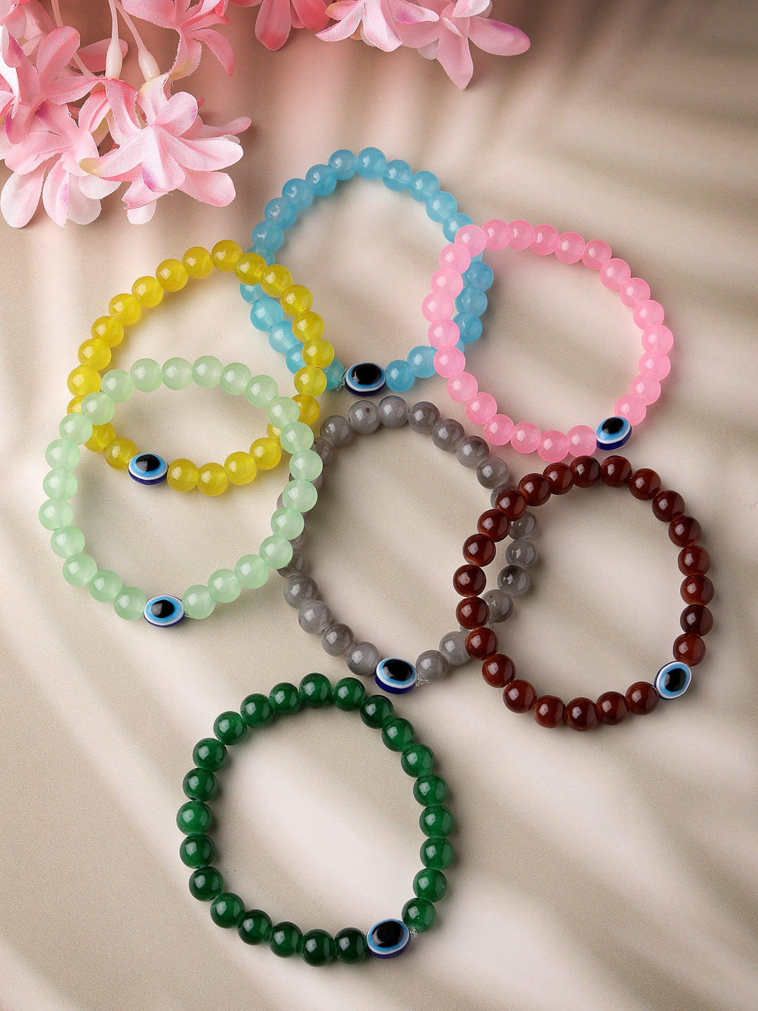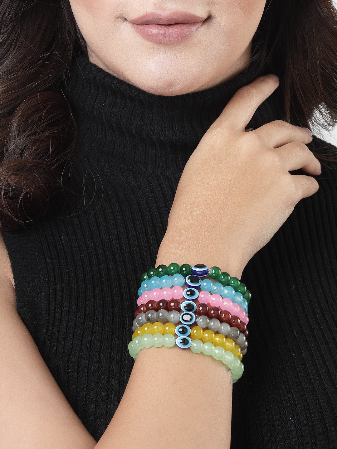 NVR Unisex Set Of 7 Crystals Beaded Evil Eye Elasticated Bracelet