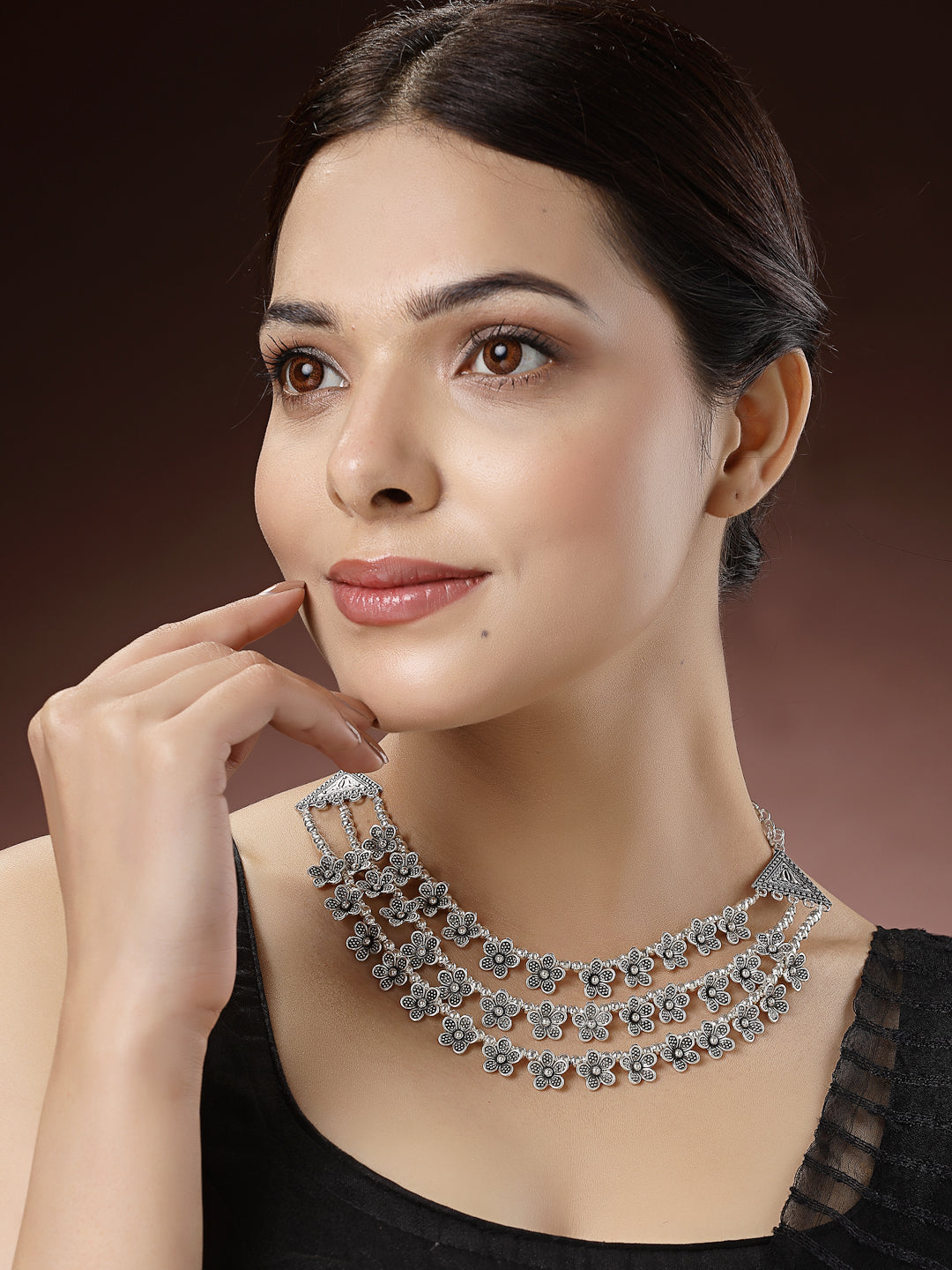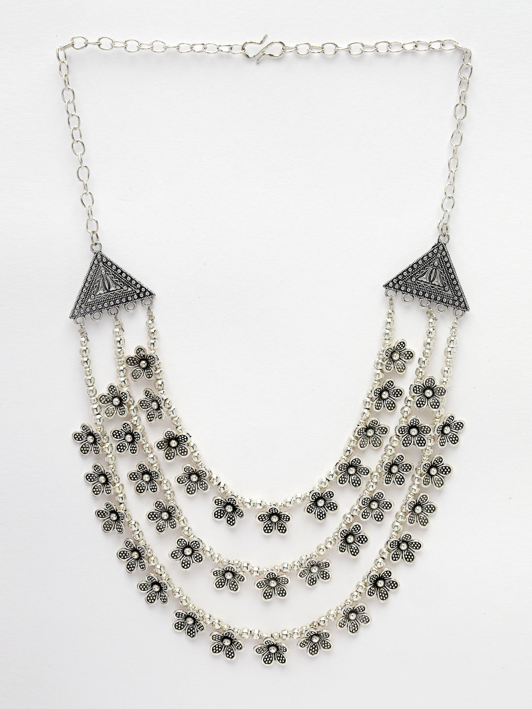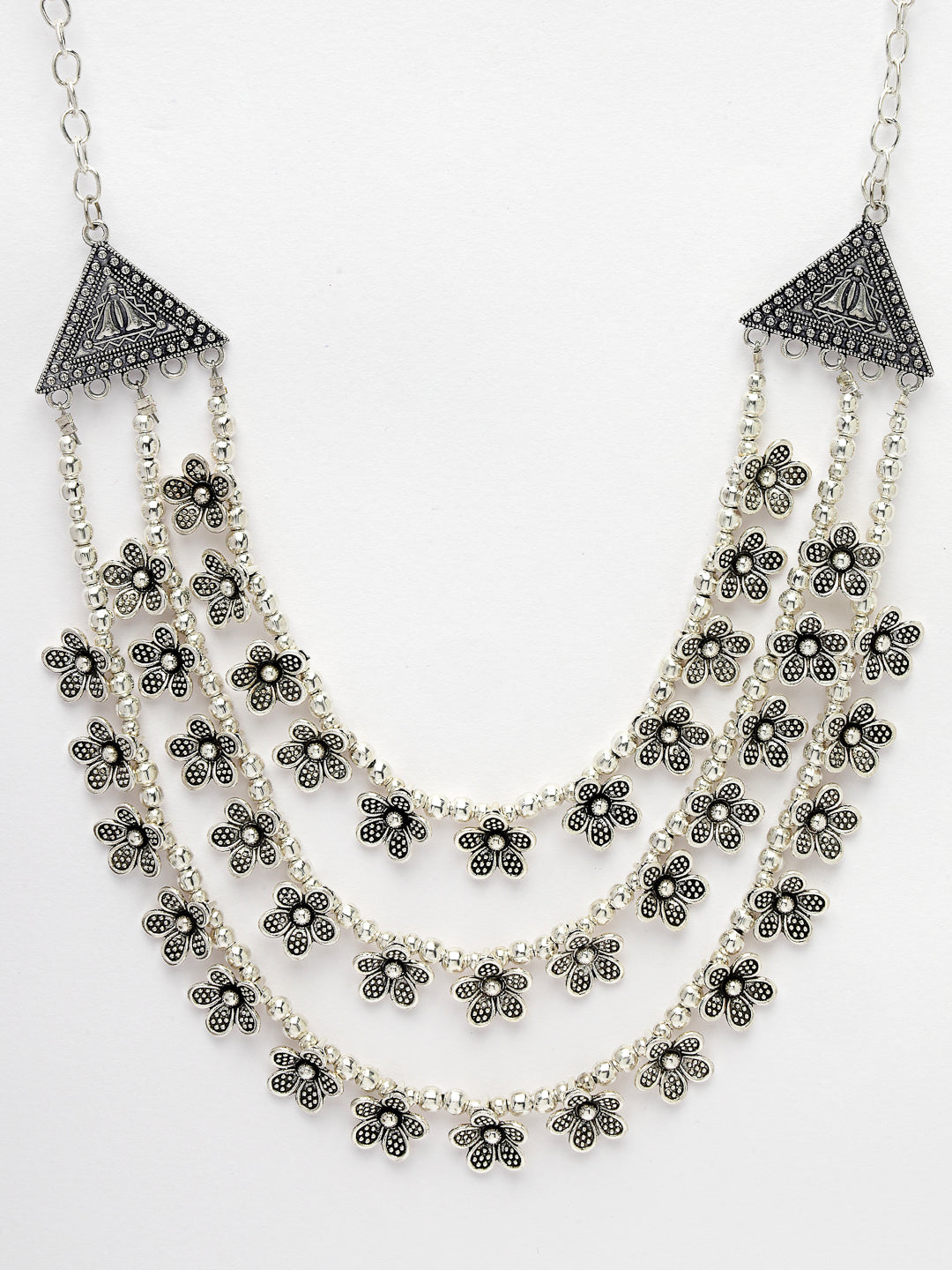 NVR Women 3 Layered Floral Shape Artificial Beads German Silver Oxidised Necklace