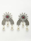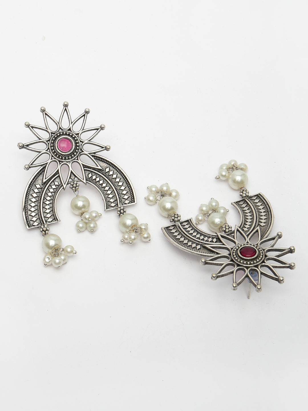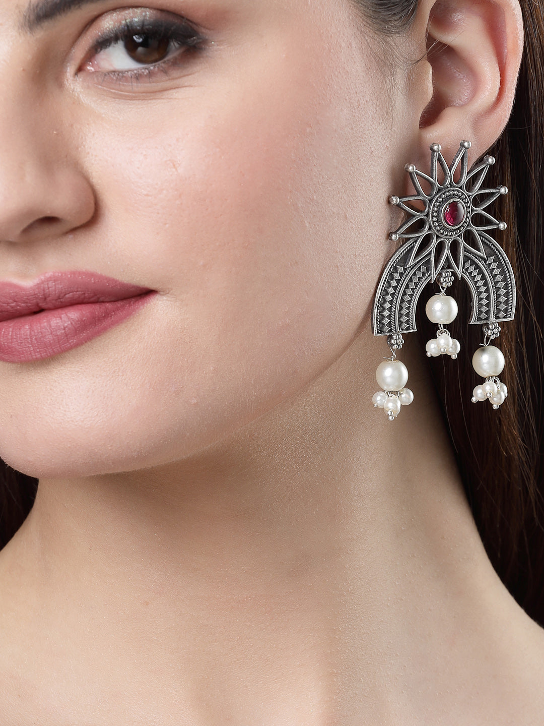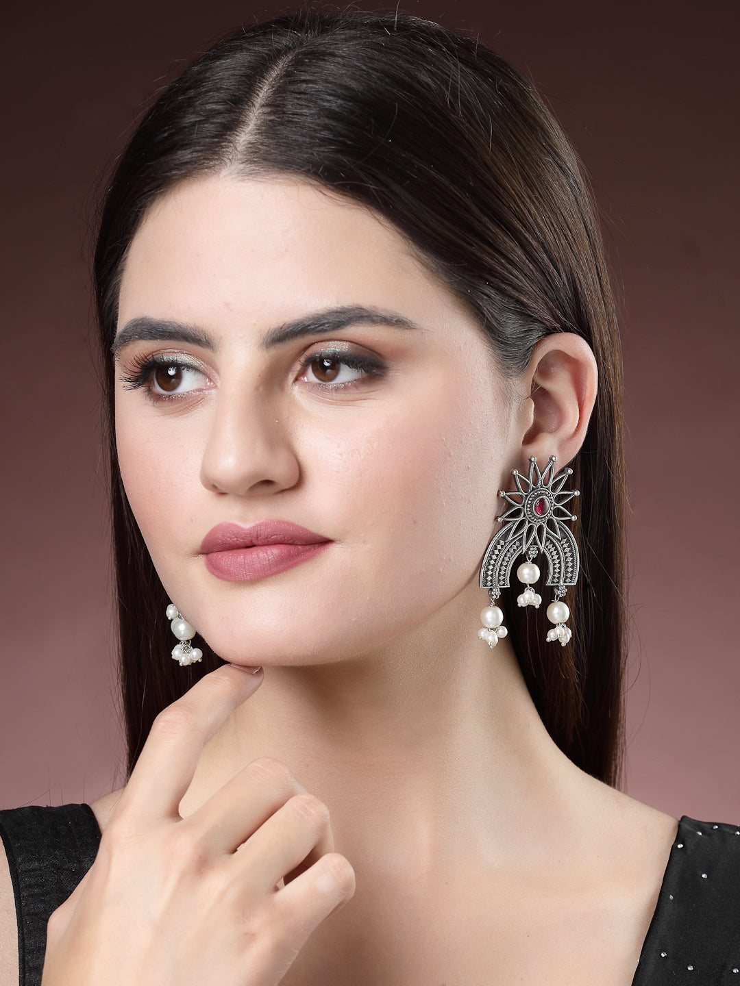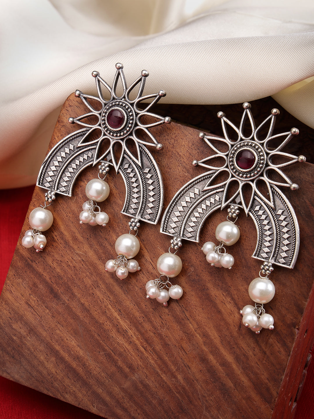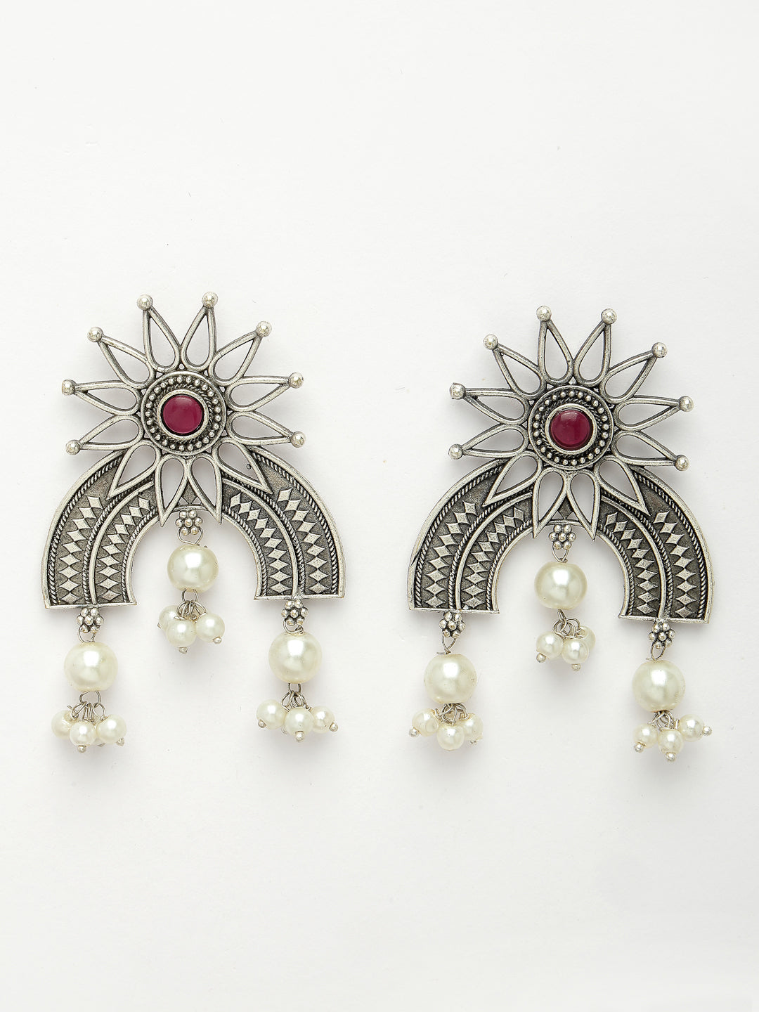 NVR Women Floral Silver-Plated Oxidised Artificial Stones and Beads Drop Earrings