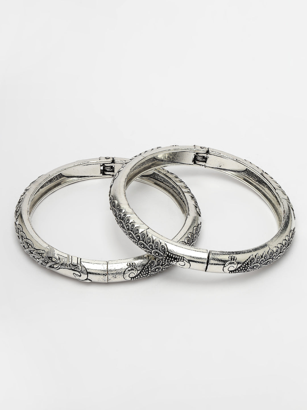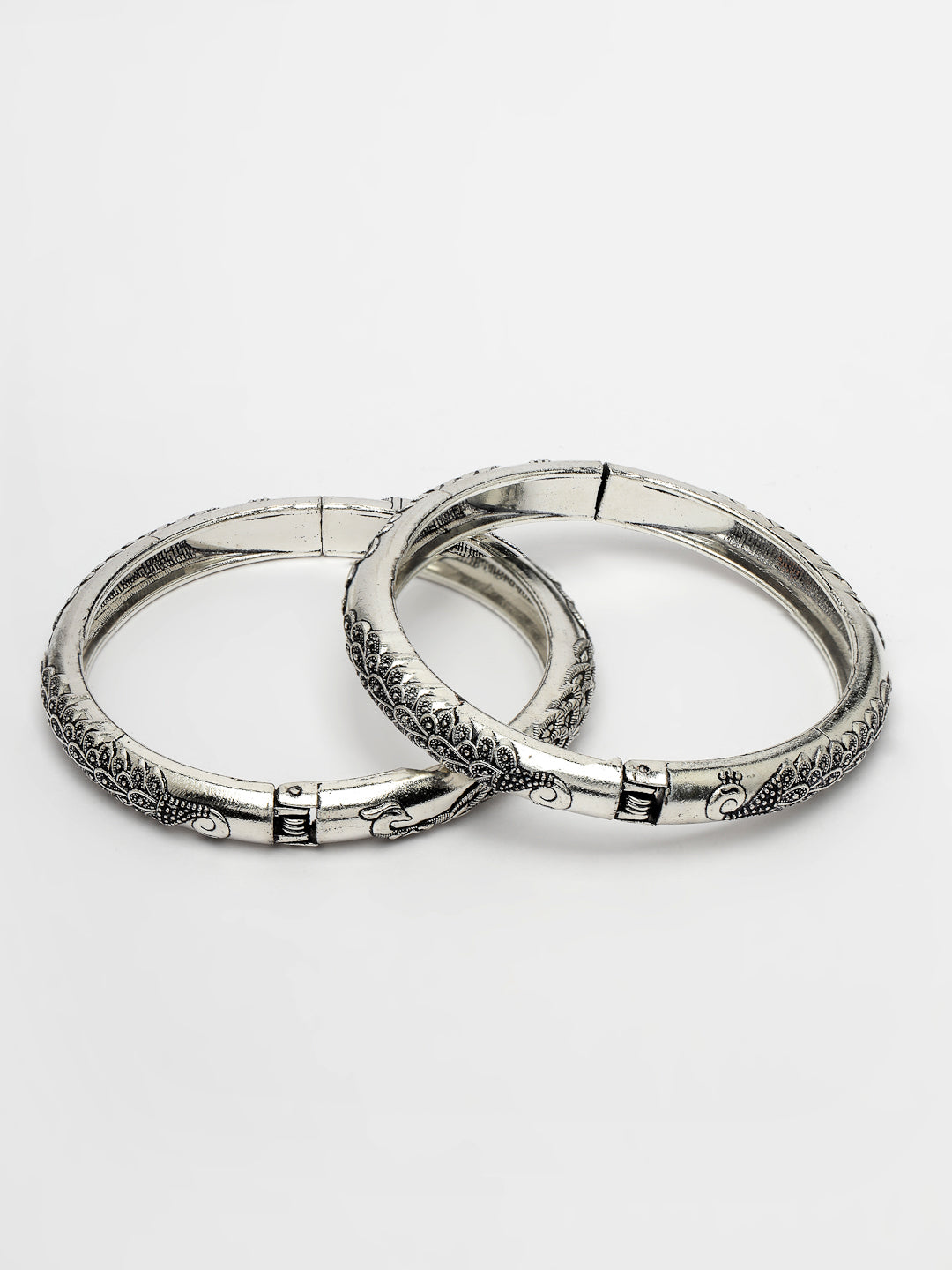 NVR Women Set of 2 Silver-Toned German Silver Peacock Design Oxidised Kada Bangle