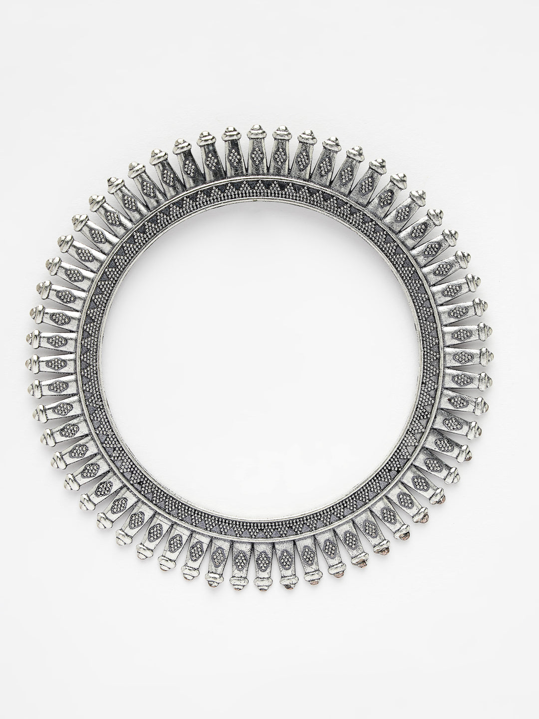 Style Note: Embrace the allure of tradition and elegance with the NVR Women Set of 6 Silver-Toned German Silver Oxidised Bangles. These beautifully crafted bangles exude a timeless charm, featuring intricate oxidized detailing that adds depth and character to your ensemble. The silver-toned hue lends a touch of sophistication, making these bangles versatile accessories suitable for any occasion, whether it's a formal affair or a casual outing. Let these handcrafted bangles adorn your wrists and elevate your style with their understated yet captivating beauty. Flaunt your impeccable taste and appreciation for craftsmanship as you effortlessly charm your way through any event.