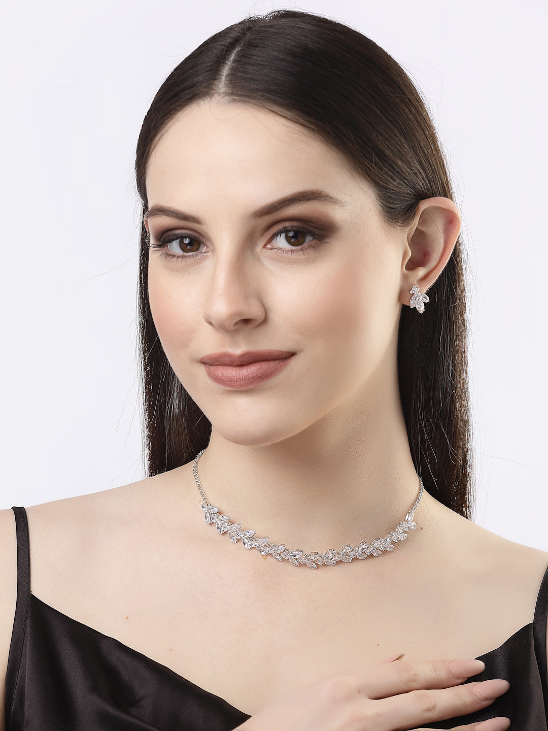 NVR Women Silver-Plated American Diamond Jewellery Set Necklace & Earrings