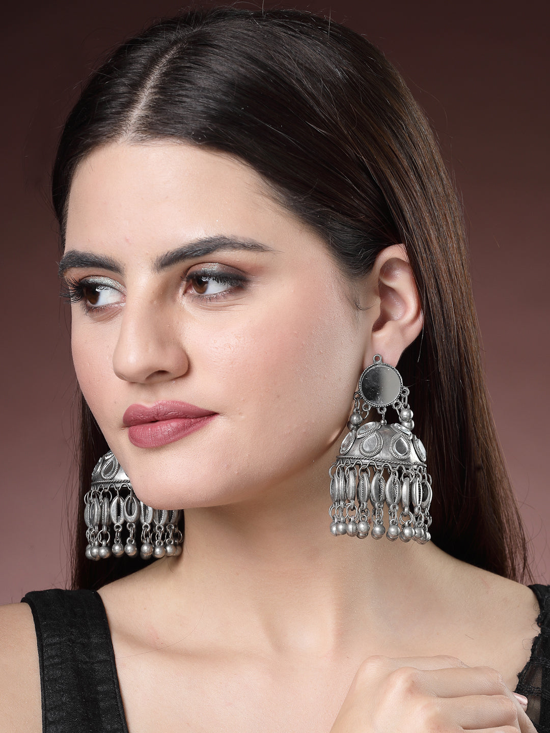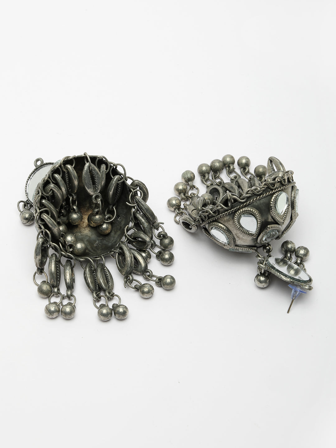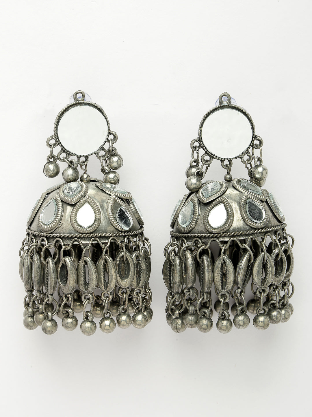 NVR Women Silver Plated Mirror Work Oxidised Contemporary Jhumka Earrings