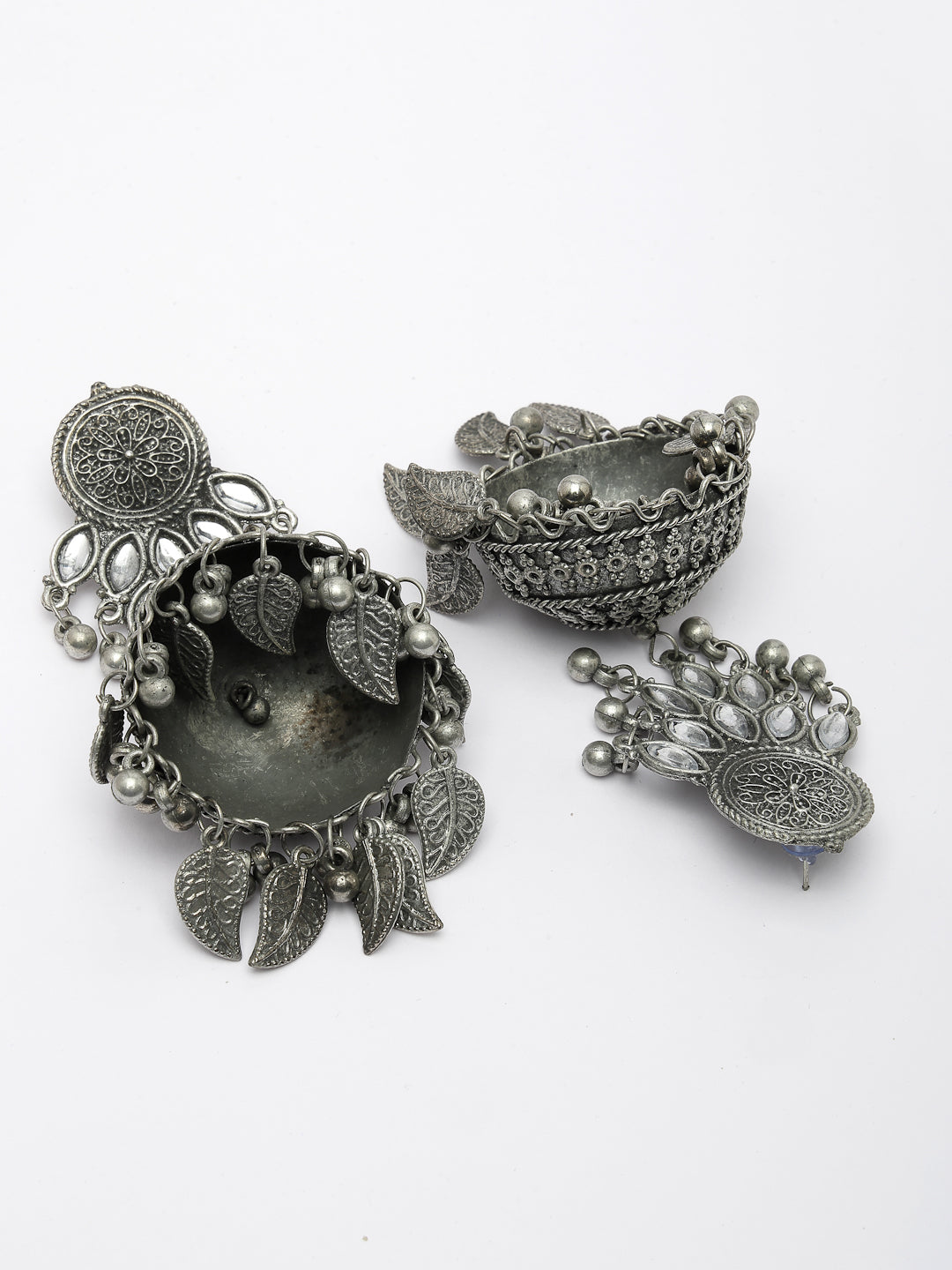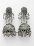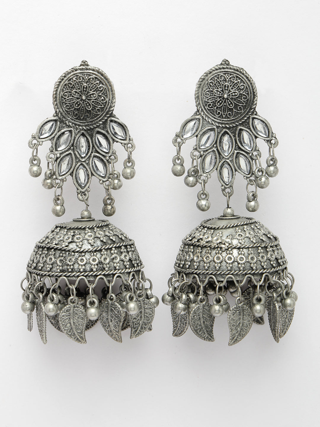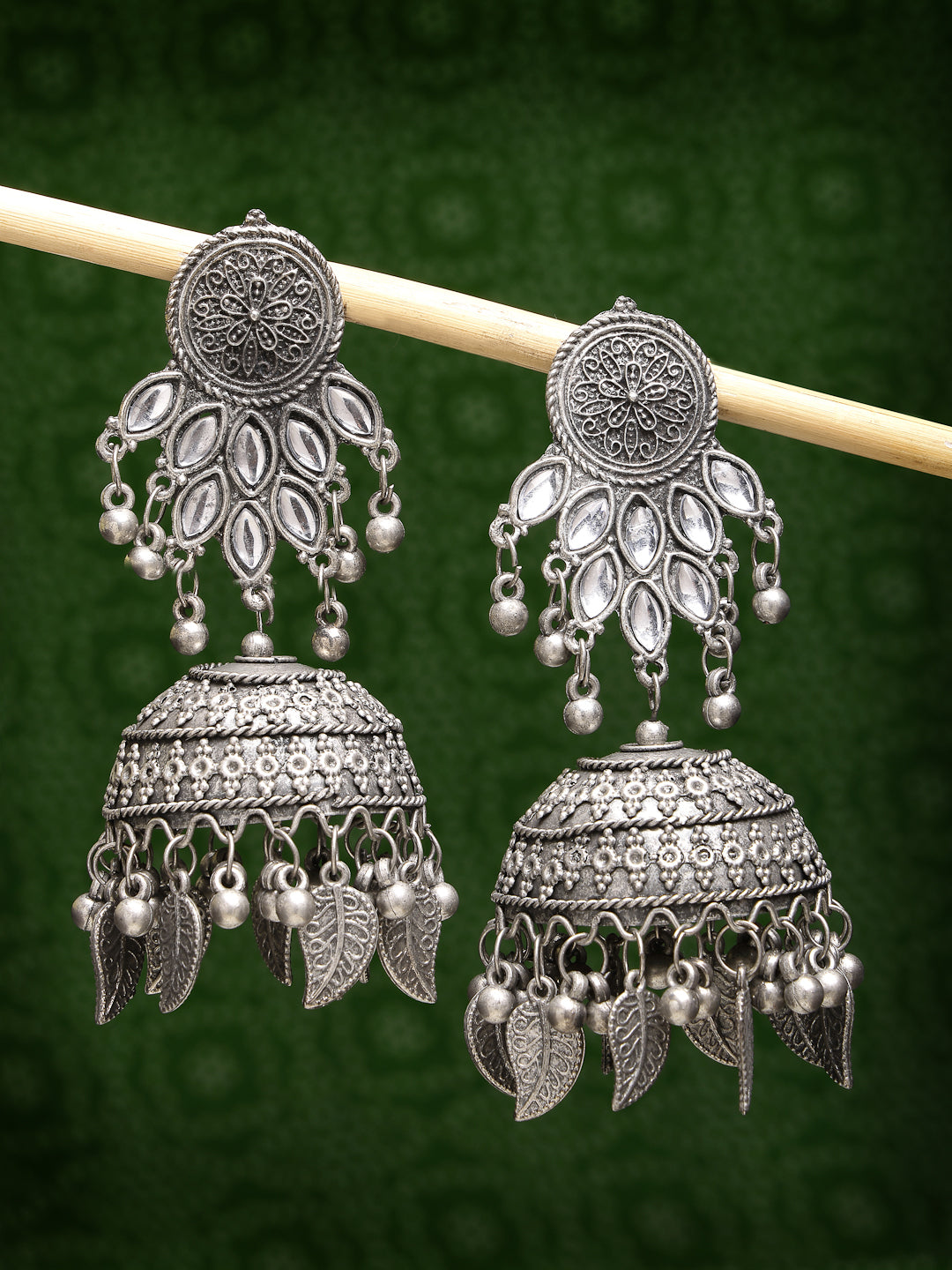 Silver-Plated Oxidised Artificial Stones Dome Shaped Jhumka Earrings