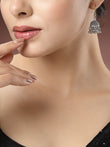 Style Note: Enhance your elegance with the NVR Women Silver-Toned German Silver Oxidised Dome Shaped Jhumka Earrings. Crafted with precision, these earrings boast a timeless charm with their oxidised finish and dome-shaped design. Their versatile silver-toned hue complements various ensembles, making them ideal for both casual outings and special occasions. Embrace their understated sophistication and let them become a staple in your accessory collection, adding a touch of grace to every look.