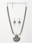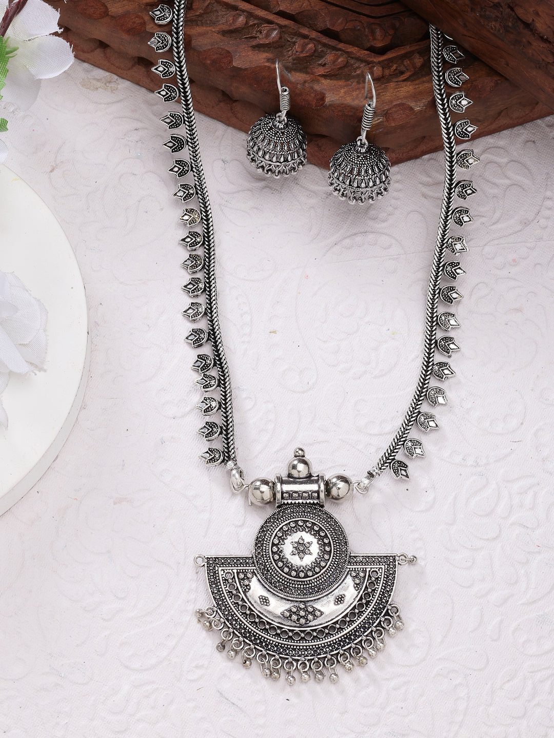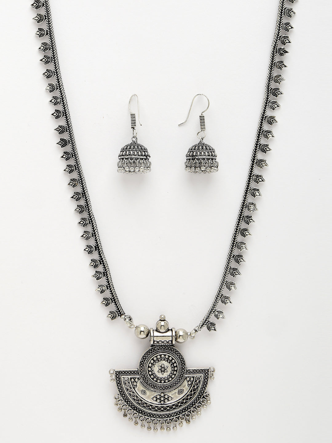 NVR Women Silver-Toned German Silver Oxidised Necklace with Jhumka Earrings
