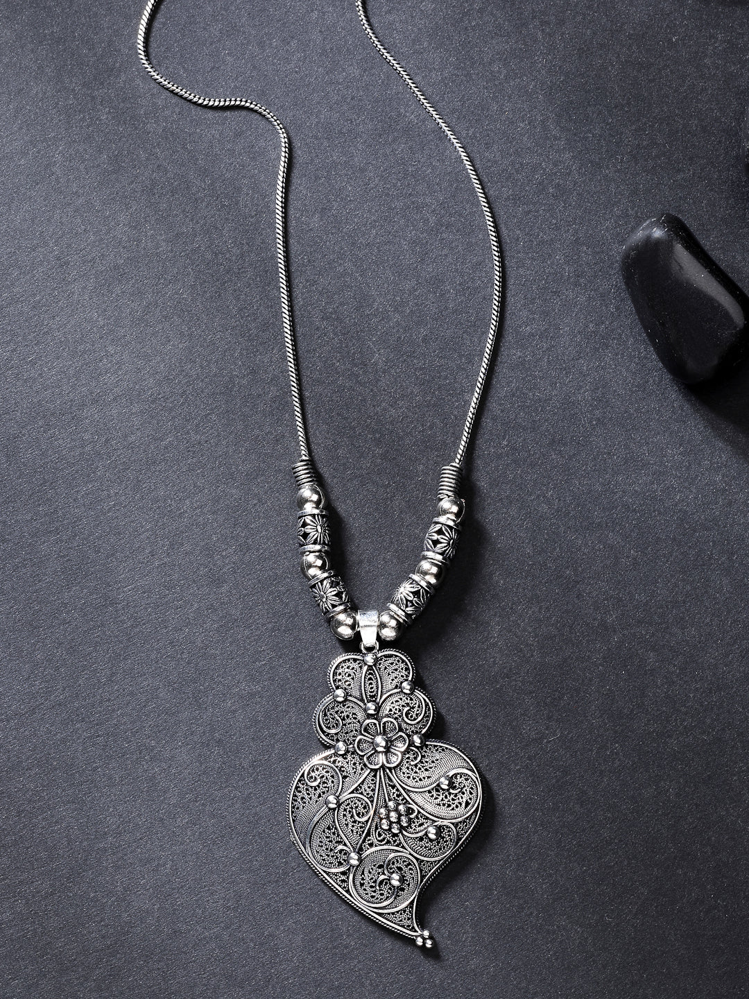 Style Note: The NVR Women Silver-Toned German Silver Oxidised Pendant with Chain is a beautiful and rustic accessory that highlights traditional craftsmanship. The oxidized silver-tone finish gives it a vintage and ethnic appeal, perfect for pairing with traditional Indian attire such as sarees or kurtis. This pendant with chain adds a cultural flair to your ensemble, making it ideal for festive occasions or cultural events. It's an excellent choice for women who appreciate artisanal jewelry that showcases cultural heritage and intricate detailing, enhancing your outfit with its timeless charm.