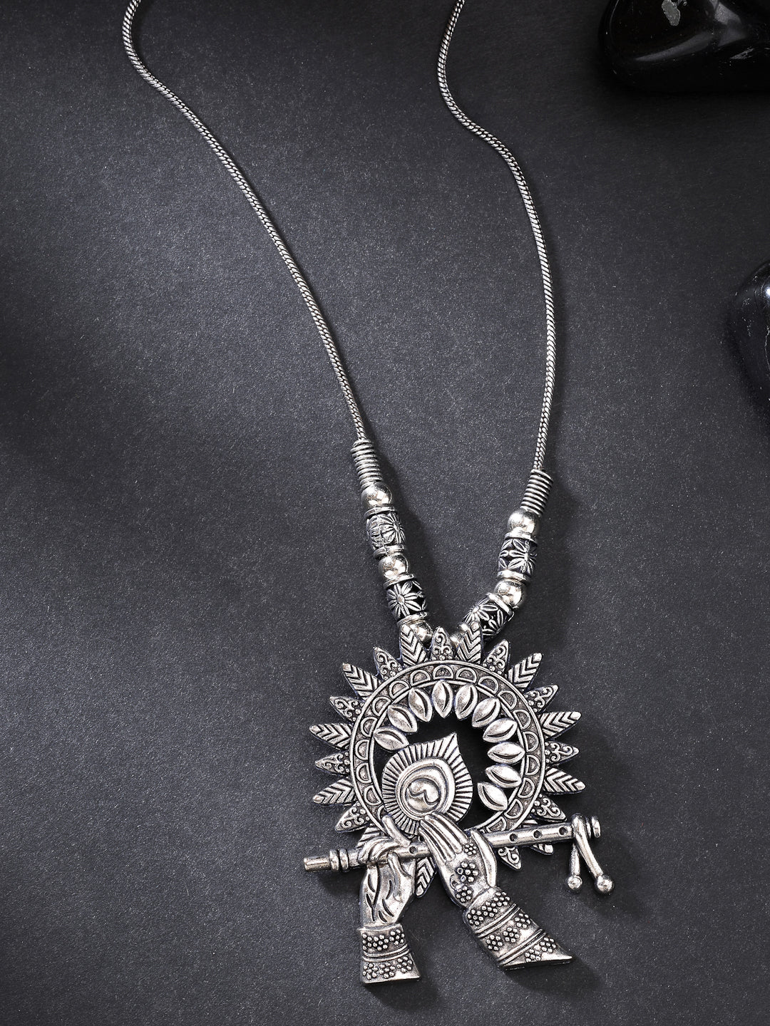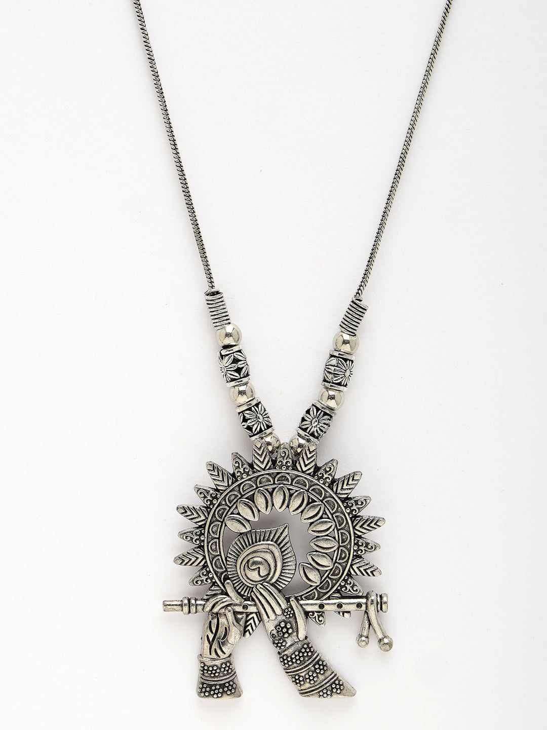 Style Note: The NVR Women Silver-Toned German Silver Oxidised Pendant with Chain is a stunning piece that showcases intricate craftsmanship and a vintage-inspired design. The oxidised silver-tone finish adds a rustic and antique look, making it perfect for pairing with traditional Indian attire like sarees or kurtis. This pendant with chain brings a cultural and artistic flair to your ensemble, making it suitable for festive occasions or cultural events where you want to express a sense of heritage and style. Ideal for women who appreciate unique and handcrafted jewelry that reflects traditional craftsmanship and timeless beauty.